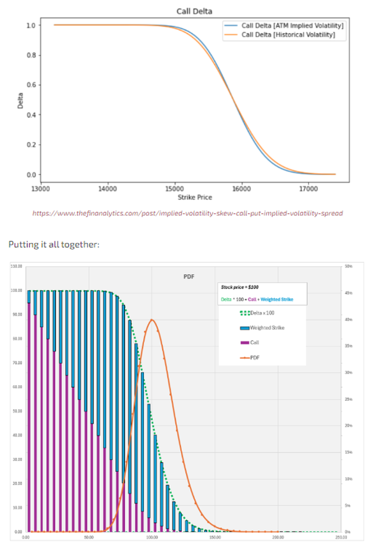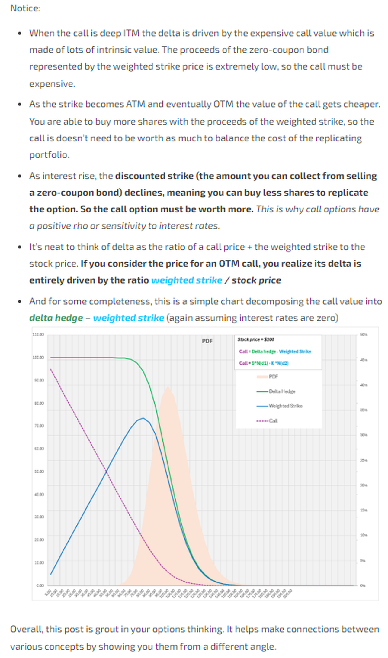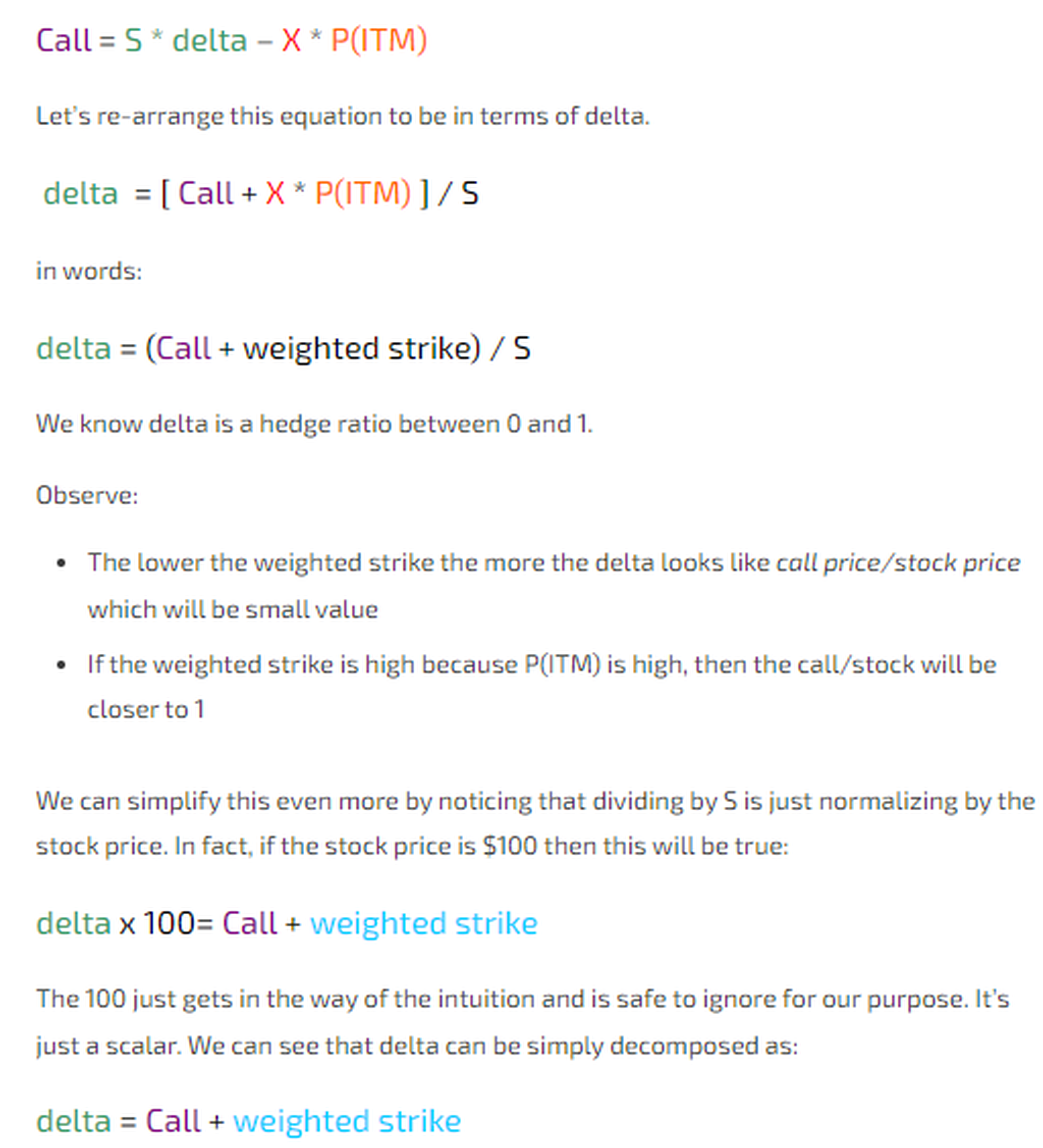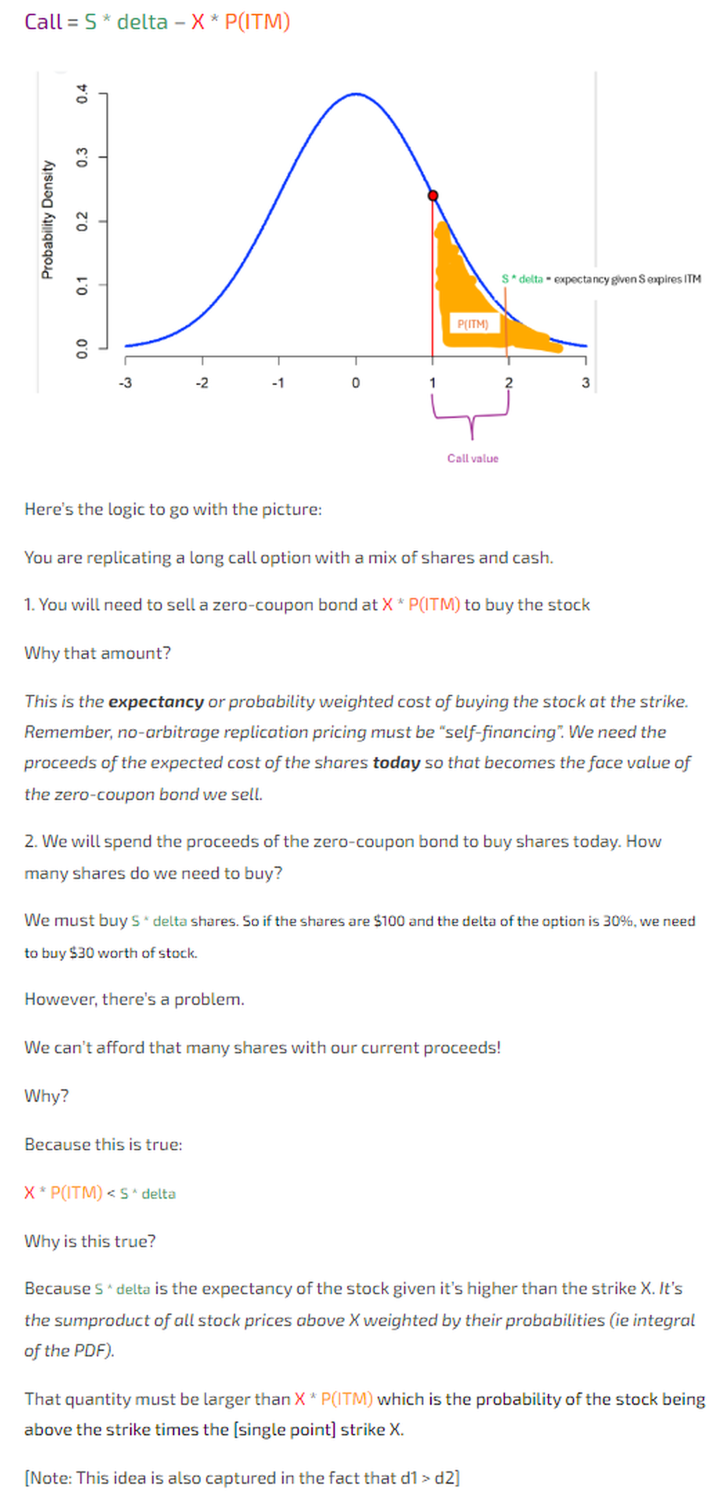 The amount of stock you need in this replicating portfolio is weighted by the expected value of the strike being in the money. Notice we say “expected value” which is not just probability but probability x payoff. The phrase expected value of the shares going in the money is what determines the delta or hedge ratio of the option.Delta = N(d1)