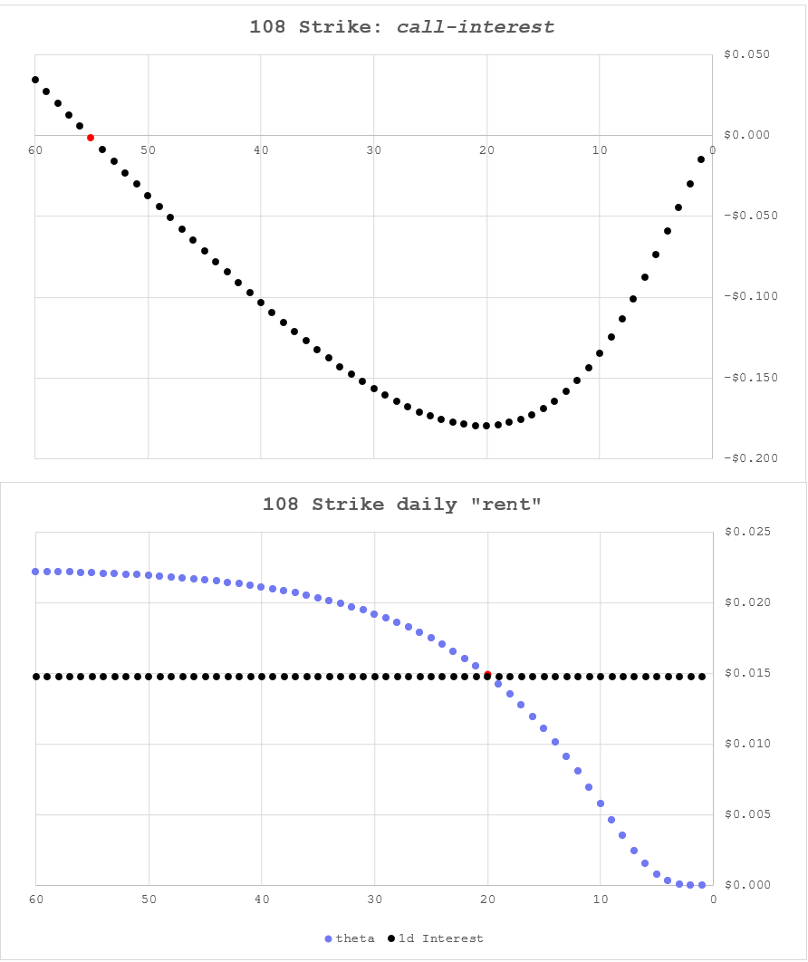 For the 108 call, it has no value several days before expiry so there’s nothing to decay. The option went through the steepest part of its depreciation days earlier. Test 2 depends on when 1d interest and 1 theta “cross”.