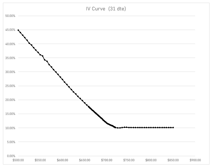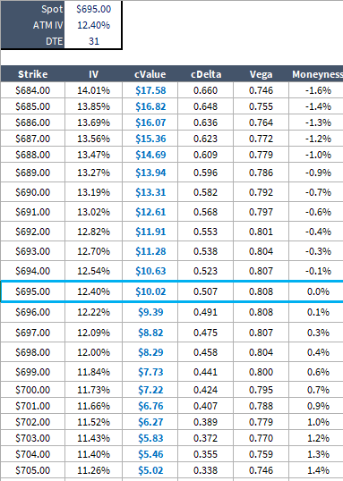 The spot price was $695.27 at the snapshot time but we are just going to keep things simple by ignoring any cost of carry and saying that spot is $695. I just wanted a sensible IV curve for demonstration purposes.
