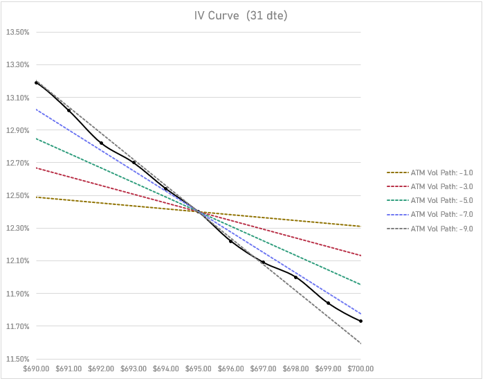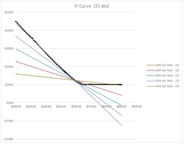 💡Notice that all of these ATM vol paths suggest a lower vol ATM vol at say the $675 strike than the actual smile implies. That is really a separate discussion, since skew is not really a “predictor” of vol anymore than a back-month future is a predictor of spot price. It is just a value that clears the market so it has risk-premiums embedded. It’s just another example of “real-world probabilities do not equal risk-neutral probabilities”. Even if that’s not satisfying, you could think of the skew as needing to average any number of price paths approaching a strike. If we drop $40 overnight, ATM IV is going to be higher than what the current $40 OTM put vol. If it takes 2 weeks, maybe not.