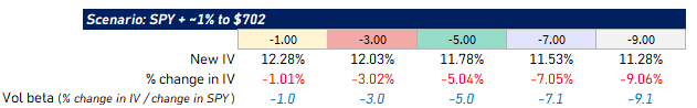 This is our IV projections according to different vol slopes for SPY shares up 1%: