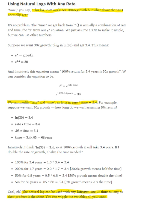 - ln (aka log base e) ~ “compounding continuously at 100% how long will it take to get X”