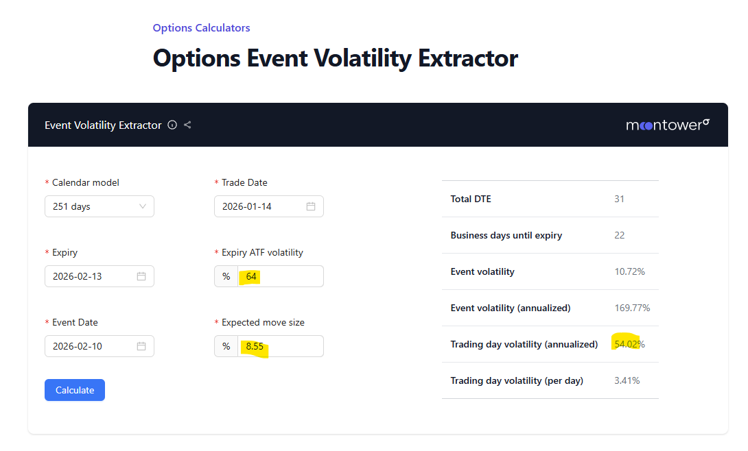 At first glance, 64% might seem elevated but let’s decompose what the market is actually pricing. When a known event, like earnings, falls within an option’s expiry, the market assigns extra volatility to that expiration. But how much of that IV comes from the event itself versus normal trading day volatility?
