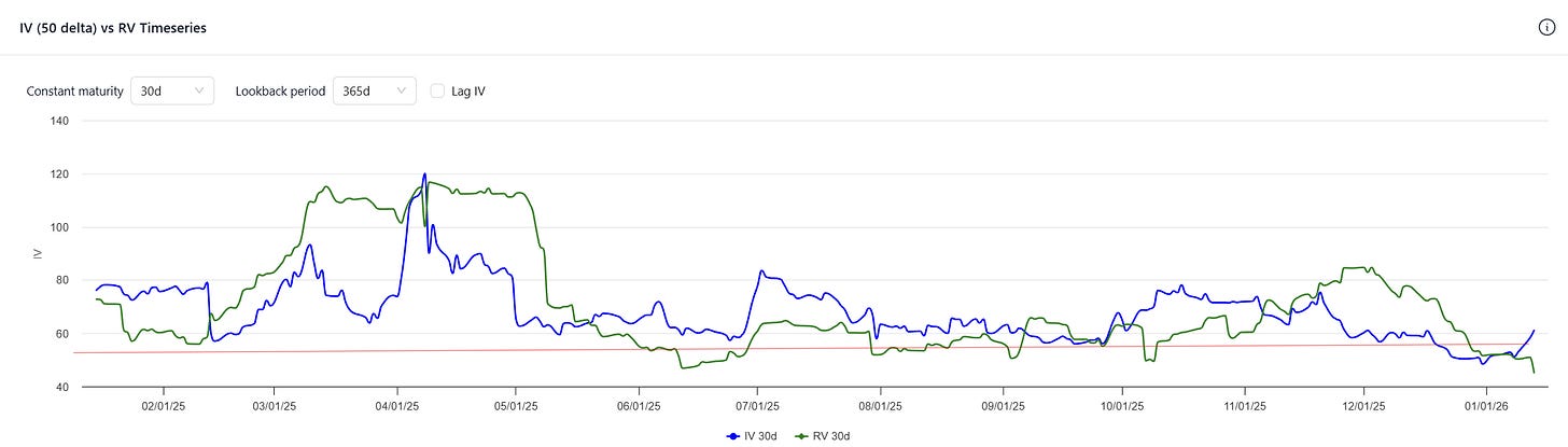 On Monday, I noticed that Robinhood ($HOOD) vol screened cheap in the Trade Ideas tool. But that tool uses 30-day constant maturity IV. Since HOOD earnings was just about 30 days out on Monday, the interpolation gave the earnings vol no weight. The pre-earnings vol is in the low 50s, which is, indeed at the bottom of the range for HOOD implied vol.