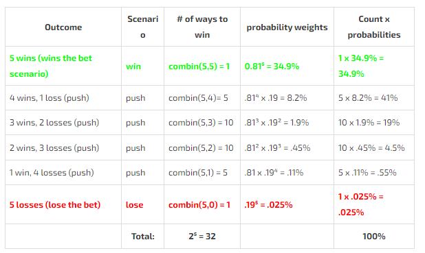 - Lose = at least one wrong in each of the 5 pairs to lose the bet