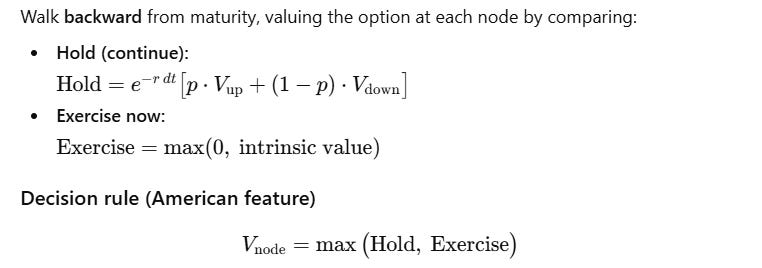 They work by pricing options just before expiry then working backward to today. At each node you ask: exercise now or wait?