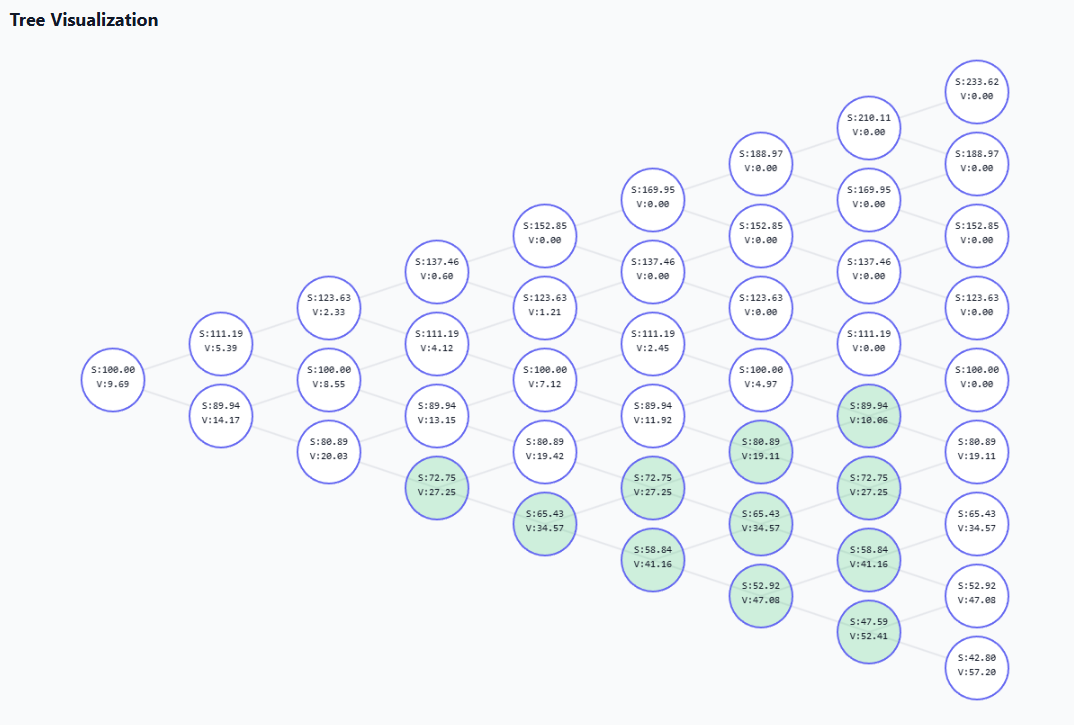 The green nodes represent early-exercise candidate conditions. A nice way to explore the tool is to see where the clustering occurs based on the inputs to build your understanding of what makes an option more or less likely to be exercised early.