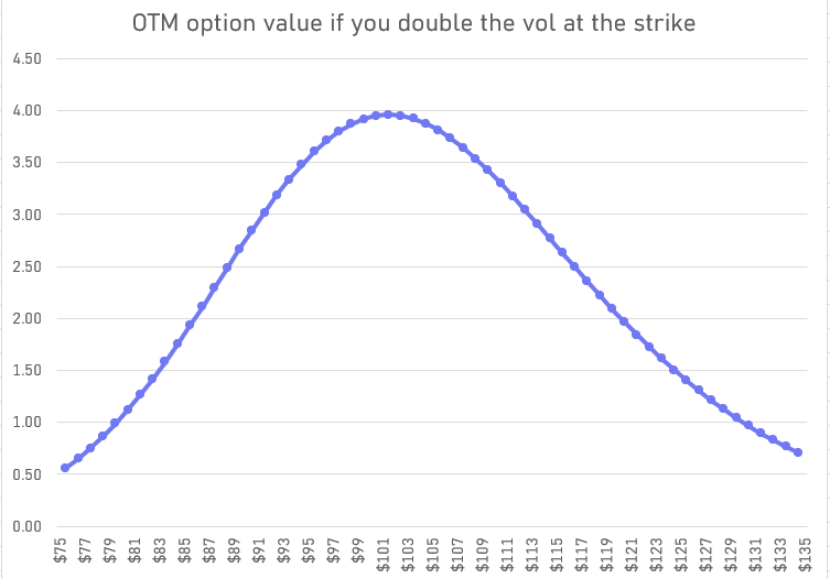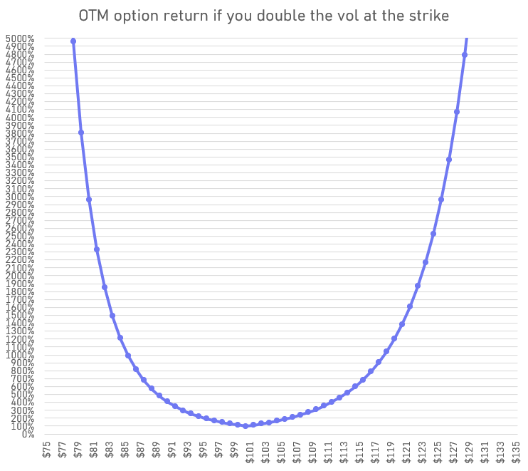 If vol doubles instantly, your ROI on an ATM option is 100% but doubling the vol on an OTM option leads to comical ROIs: