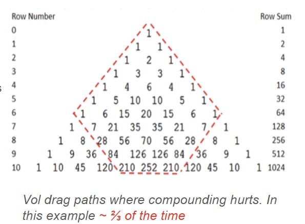 If you step through a random walk where a stock can either go up or down X% you find that in most paths, the ones where we chop or recombine frequently (the paths fenced in red), your compounded return is less than if you simply added up all the daily returns and applied them to $100. Be careful: volatility doesn’t change your expectancy, only the distribution of return.