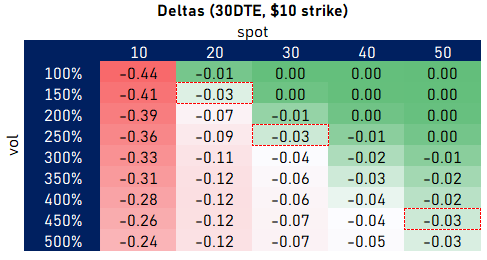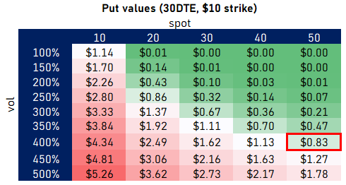 Let’s consider the $10 strike put of a meme stock that has surged to bubble territory. Maybe it was $10 and shot to $50. Its vol explodes. Let’s look at a matrix of spot and implied vol pairs for the $10 strike with 30 DTE.