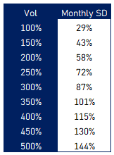 Oh and just to put ridiculous vols in context, this is a table of vols and what they imply for monthly standard deviation of returns. Just divide vol by √12: