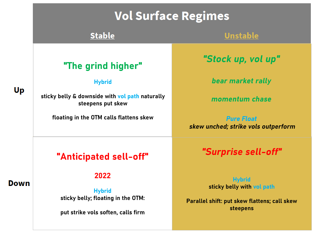 This is a good place for judgment. You build an understanding of how the surface changes for various types of moves while acknowledging that this depends on the market context and open interest. If investors are well-hedged to the downside like they were in 2022 (the market sell-off and rise in interest rates were extremely well telegraphed), then you might expect put skew to underperform on the way down. You certainly don’t want to run a fixed strike model in that case.