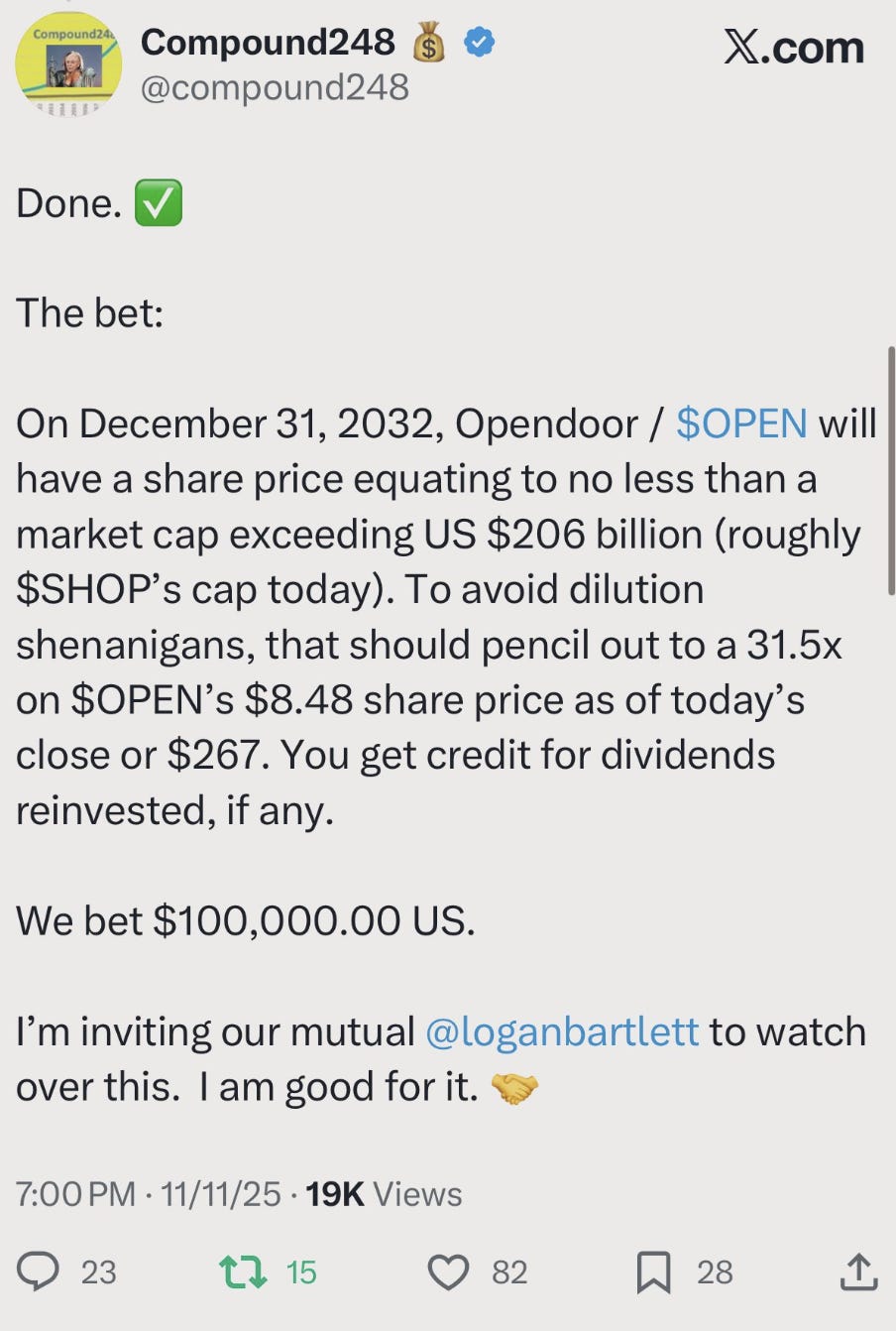 Keith needs a heroic move to simply get paid even money. His proposition is an arbitrageable violation of how return works. I don’t know anything about Compound248’s outlook on $OPEN by him taking the bet. He could be bullish or bearish. When you hear the proposition, your mind shouldn’t go to “Is $OPEN a good or bad investment?” because what you should do doesn’t depend on this assessment.
