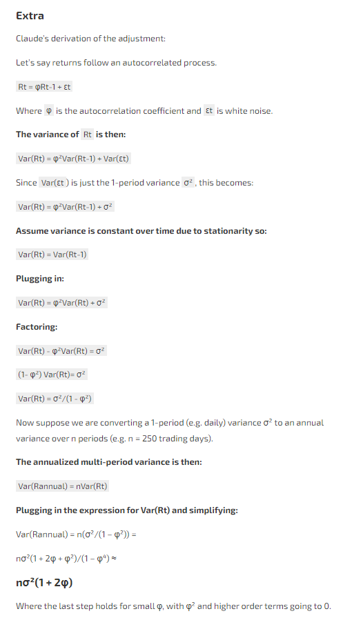 But with autocorrelated returns, variances don’t just add up independently. The adjustment accounts for this by multiplying the standard formula by (1 + 2 x Autocorrelation).
