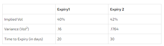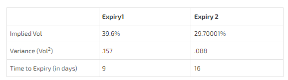 Expiry 2 has the same total variance as Expiry 1 which means there is zero implied variance between day 9 and day 16.