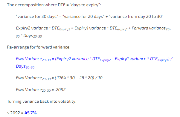 This works in reverse as well. If the 30-day implied volatility were lower than the 20-day vol, then the 20-30 day forward vol would need to be lower than the 30-day volatility.