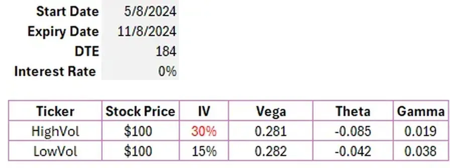 Consider 2 stocks, HighVol and LowVol. They are both $100 and we are going to initiate a pair trade in a 6-month options.