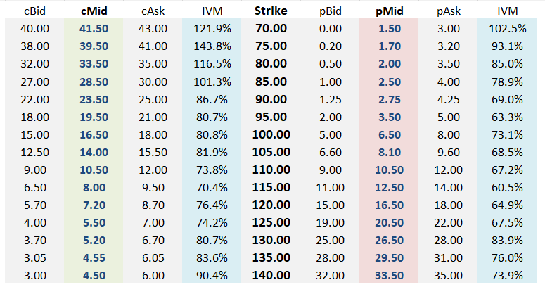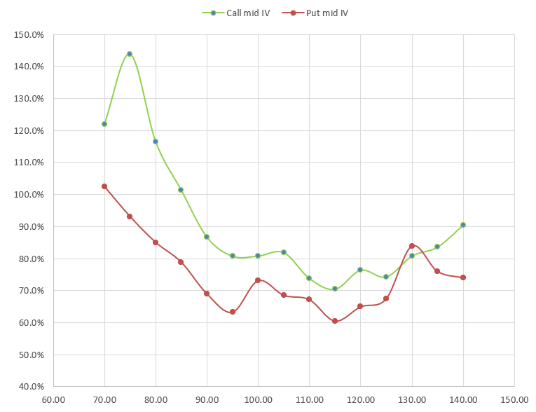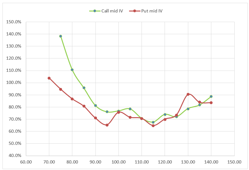 Well, before you start thinking “The 125/130/135 call fly is negative, yay free money”, you should recognize that the market widths are obscuring this vol surface. I mean, if you think you can trade at mid-market, there’s free money all over this board. All kinds of bells should be going off but just as a surgeon has a checklist, there is definitely a priority thing to look for.