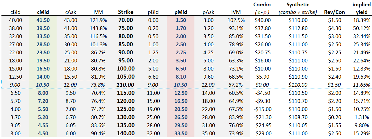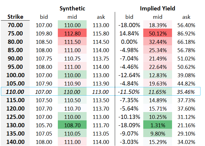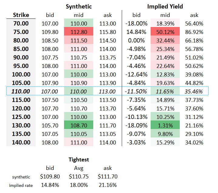 We cobble together the best bid and offer from any of the strikes to imply a yield. I don’t love this method for actually estimating the rate, but it’s the fastest way to spot an arb! Look at all the implied rates…the 75 strike really sticks out like sore thumb. If you hit the call bid and lift the put offer you have synthetically sold the stock at $109.80. If you buy the shares for $108.50, borrowing to finance them until expiry in 43 days, you will have legged a “conversion” trade for a fat profit.