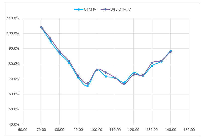 If you don’t want to dismiss all the information from the ITM option on the strike, you could weight the IV inversely to the market widths or even to the options’ contribution to the straddle price on the strike. Here’s the vol curves using the OTM method and the Inverse Contribution To Straddle method: