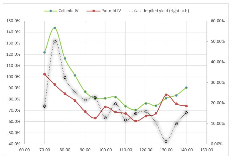The right-most column shows the implied yield of each strike. By computing an implied yield the call and put IVs are forced to be the same but I left the stale ones in the table for the sake of this chart: