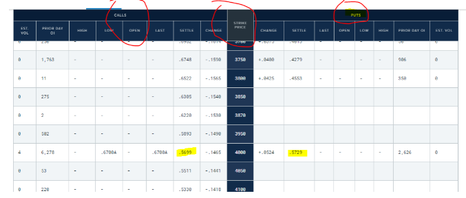 For April futures the ATM strike is the $4.00 line. You can see the J straddle (ATM C + P) settled around $1.14