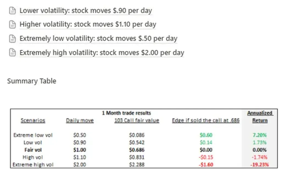 We continue to assume you sold the 103-strike call at $.69, the fair value for the option if the stock moves $1 per day. It is rare that you trade an option at exactly the level of volatility the stock realizes until expiration.