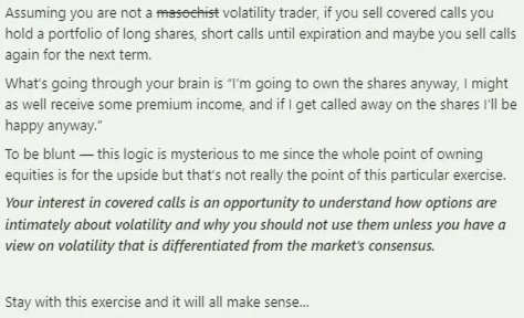 But the covered call seller clipping some coupon that “averages down their purchase price” or some marketing b.s. like that is now implicitly a volatility trader that just has a long bias.