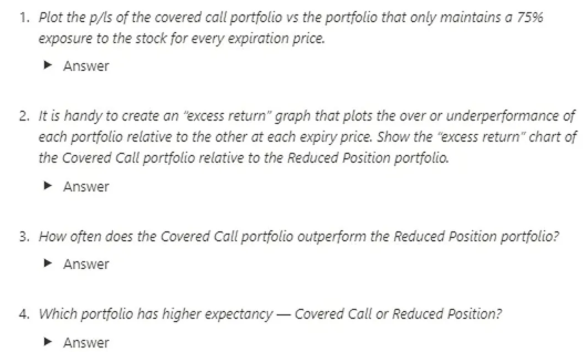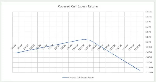 - Excess return charts showing the p/l of the Covered Call Portfolio minus the Reduced Position, (ie 75% exposure portfolio) at each possible expiration price.